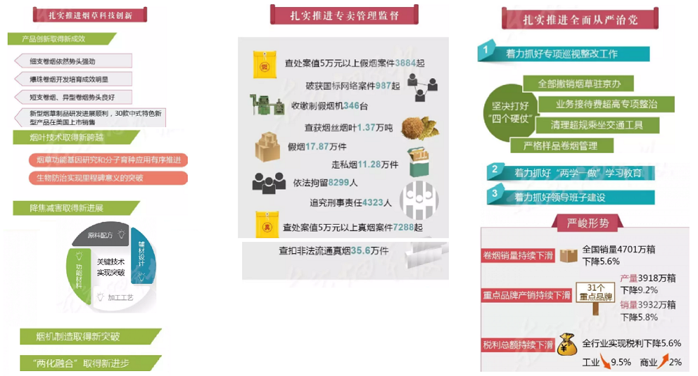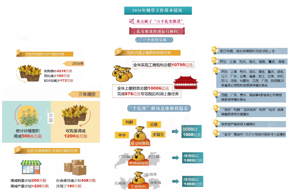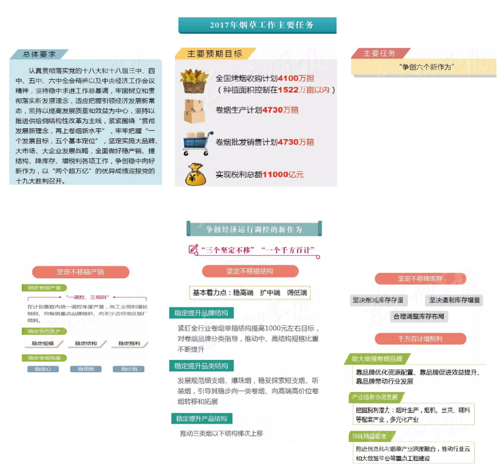 2017年全國(guó)煙草工作會(huì)議在北京召開,國(guó)家局局長(zhǎng)凌成興在會(huì)上作了題為《堅(jiān)持穩(wěn)中求進(jìn)總基調(diào) 爭(zhēng)創(chuàng)穩(wěn)中向好新作為以“兩個(gè)超萬億”優(yōu)異成績(jī)迎接黨的十九大勝利召開》的報(bào)告。