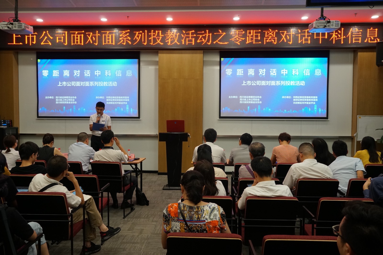 8月28日下午, 中科信息 (證券代碼:300678)參加了由四川省證券期貨業(yè)協(xié)會、四川省上市公司協(xié)會、四川投資基金業(yè)協(xié)會主辦的上市公司面對面系列投資者教育活動。此次活動主題為“零距離對話中科信息”,中科信息董事會秘書尹邦明、財務總監(jiān)劉小兵、四川省上市公司協(xié)會會員部副主任黃慶華及四川省內部分機構及個人投資者100余人參與了本次活動。