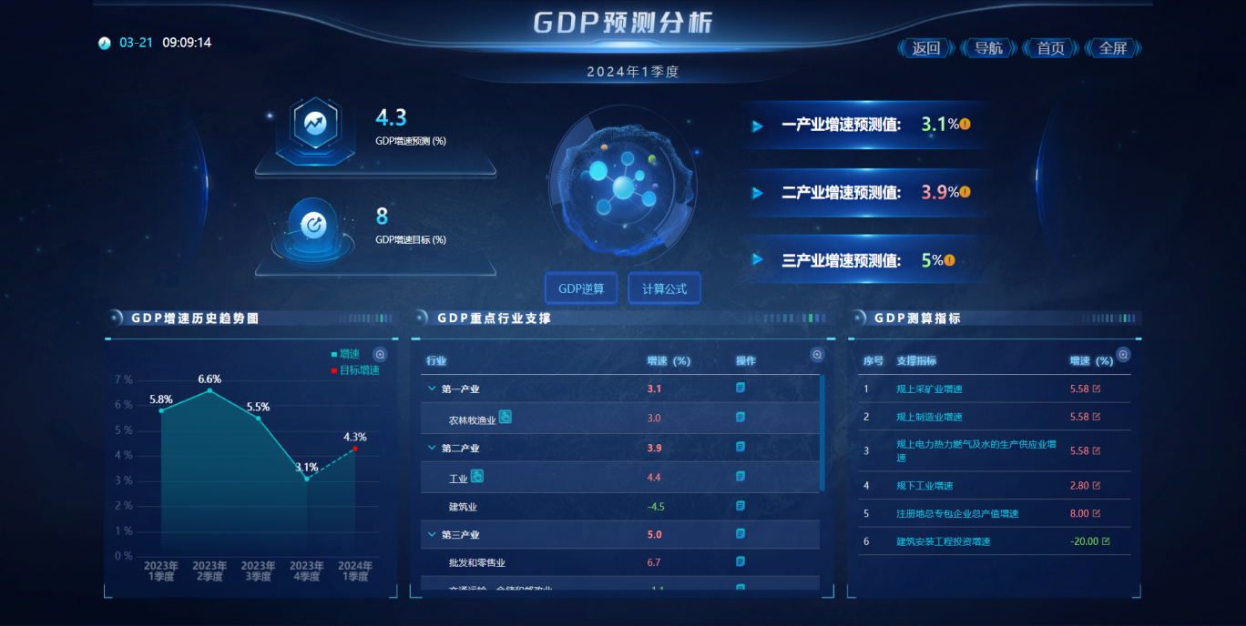 按照GDP核算體系結(jié)合相關(guān)內(nèi)置的科學(xué)模型,針對下個周期的經(jīng)濟運行走勢(重點經(jīng)濟指標)進行預(yù)測及研判,并通過經(jīng)濟運行智慧調(diào)度平臺對初步的走勢結(jié)果進行調(diào)度分析與目標任務(wù)的分解下發(fā),真正實現(xiàn)經(jīng)濟調(diào)度“智能化”。